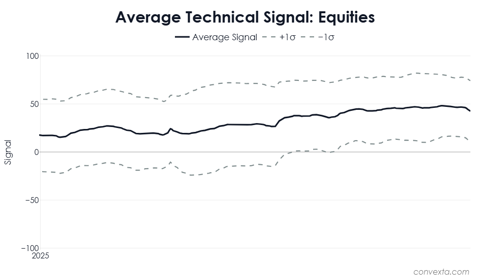 Technical signals for Equities have moved somewhat lower, mainly driven by slight trend deterioration, but remain at healthy bullish levels. CTA signals are nowhere near warning levels, and further buying is in the cards for a range of combinations of moderating volatility and firming prices from current levels.