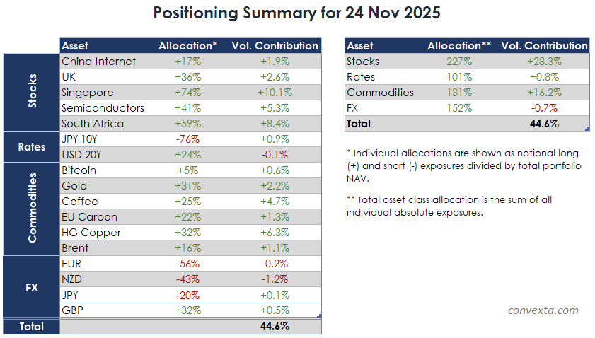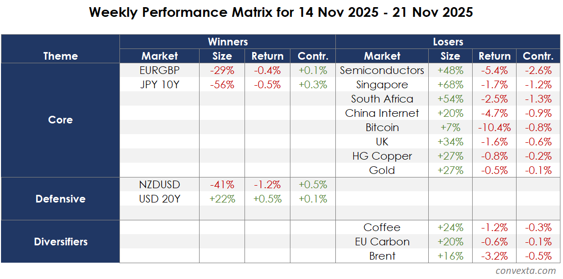 Long Semis was the largest loser, reducing the portfolio NAV by c. 2.6%, followed by MSCI Singapore (-1.2%), JSE40 (1.3%) and China Internet stocks (-0.9%). Bitcoin continued to lead the declines, dropping more than 10% on the week to sub-85k levels - a strong support zone. However, the damage to the portfolio was limited to 0.8% as the exposure had been cut from c. 24% on 20 Oct to c. 7% a week ago.