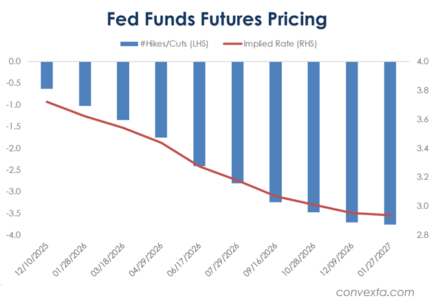 Taken together, the combination weakens the case for staying restrictive and strengthens the argument that the balance of risks across both mandates is shifting in favour of easing. Friday morning’s dovish comments by John Williams (NY Fed President) had a visible impact: at the week’s close, Fed Funds Futures were pricing a 63% chance of a cut at the next meeting, up from 43% a week earlier.