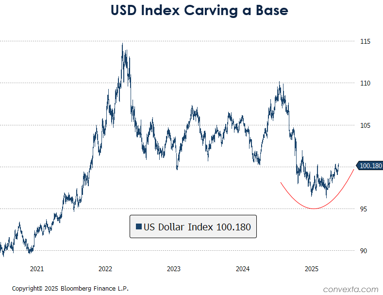 The broad USD index looks like it’s forming a base. A break above 100.35 this week would be a clean confirmation, adding conviction to the long-USD stance.