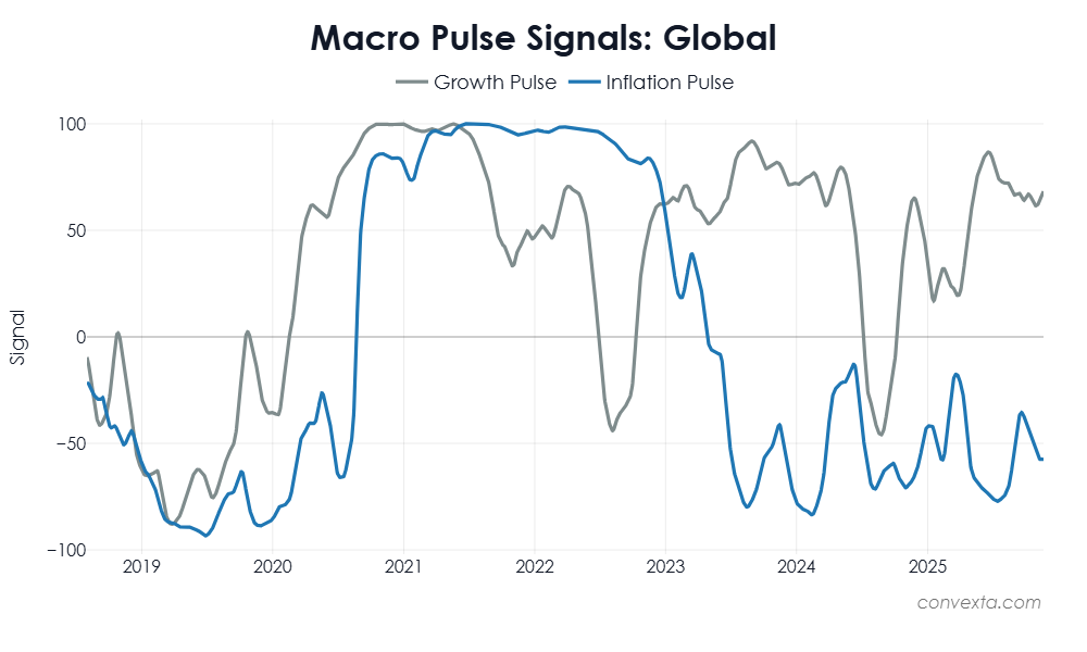 U.S. Import Prices for October landed at 0.0% m/m, in line with consensus and consistent with softening traded-goods inflation. This keeps the inflation component of the Macro Pulse signal in the comfortably negative range: inflation surprises are likely skewing to the downside, even if headline levels remain slightly above target.